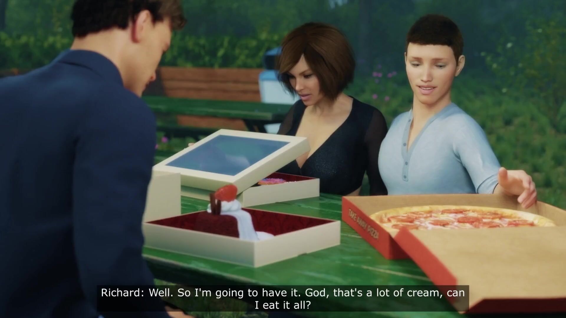 At a sunny picnic, big ass MILF Cora sneaks under the table to blow a guy while her husband is seated right next to them. As soon as he steps away for pizza, Cora rides the big cock in the grass and ends dripping creampie.